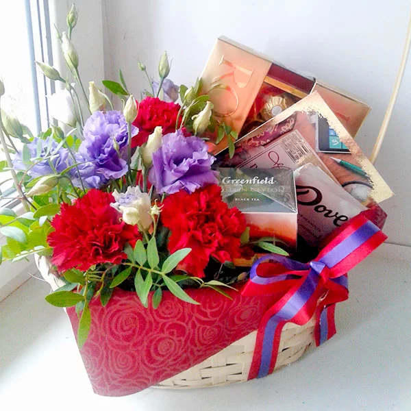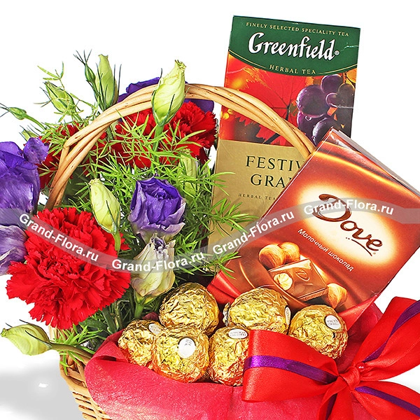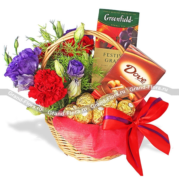 ЛЮКС: шоколад "DOVE" - 1 шт., чай "Greenfield" - 1 шт., конфеты "Ferrero Rocher" - 1 шт., эустома - 4 шт., гвоздика - 5 шт., декоративная зелень, оазис, корзина малая, красно-фиолетовый бант, фетр.