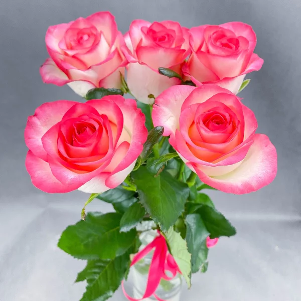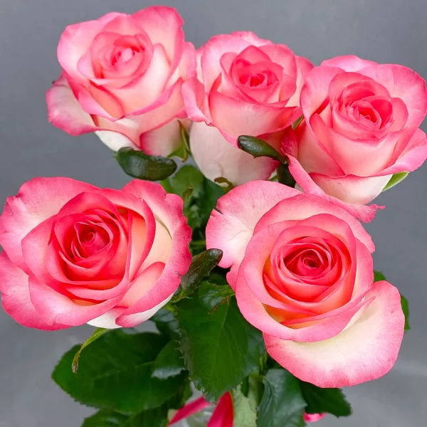 5 классических одоголовых роз в бело-розовой гамме будет уместно преподнести в качестве комплимента и подарка без особого повода, в знак восхищения и уважения. Дополнить свой цветочный подарок вы всегда можете коробкой шоколадных конфет, мягкой игрушкой и поздравительной открыткой с вашими пожеланиями.